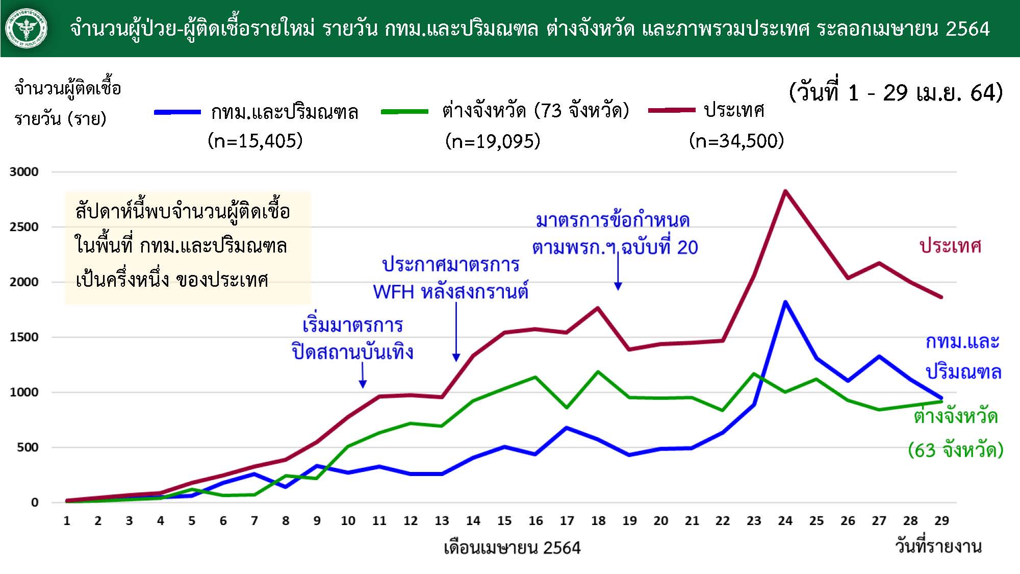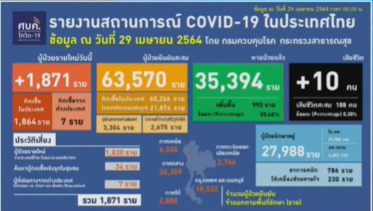 วันที่ 29 เมษายน 2564 นายแพทย์ทวีศิลป์ วิษณุโยธิน โฆษกศูนย์บริหารสถานการณ์โควิด-19 (ศบค.) รายงานสถานการณ์ยอดผู้ติดเชื้อโควิดรายใหม่วันนี้ว่า พบผู้ติดเชื้อรายใหม่เพิ่มขึ้นอีก 1,871 ราย เสียชีวิตเพิ่มอีก 10 คน โดยเป็นการติดเชื้อในประเทศ 1,864 ราย ติดเชื้อจากต่างประเทศ 7 ราย