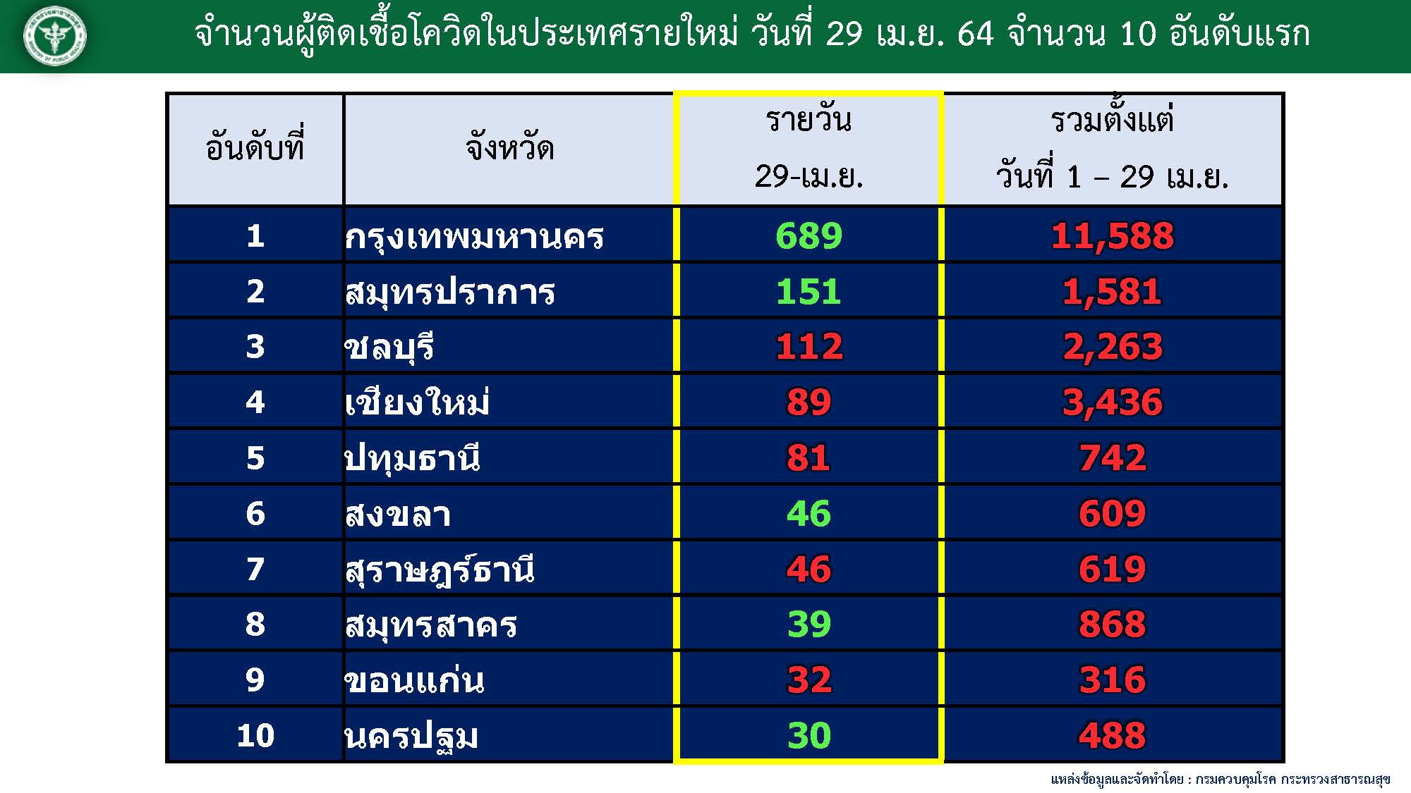 สำหรับ 10 จังหวัดที่มีผู้ติดเชื้อรายใหม่สูงสุดวันนี้(29เม.ย.64) ได้แก่
