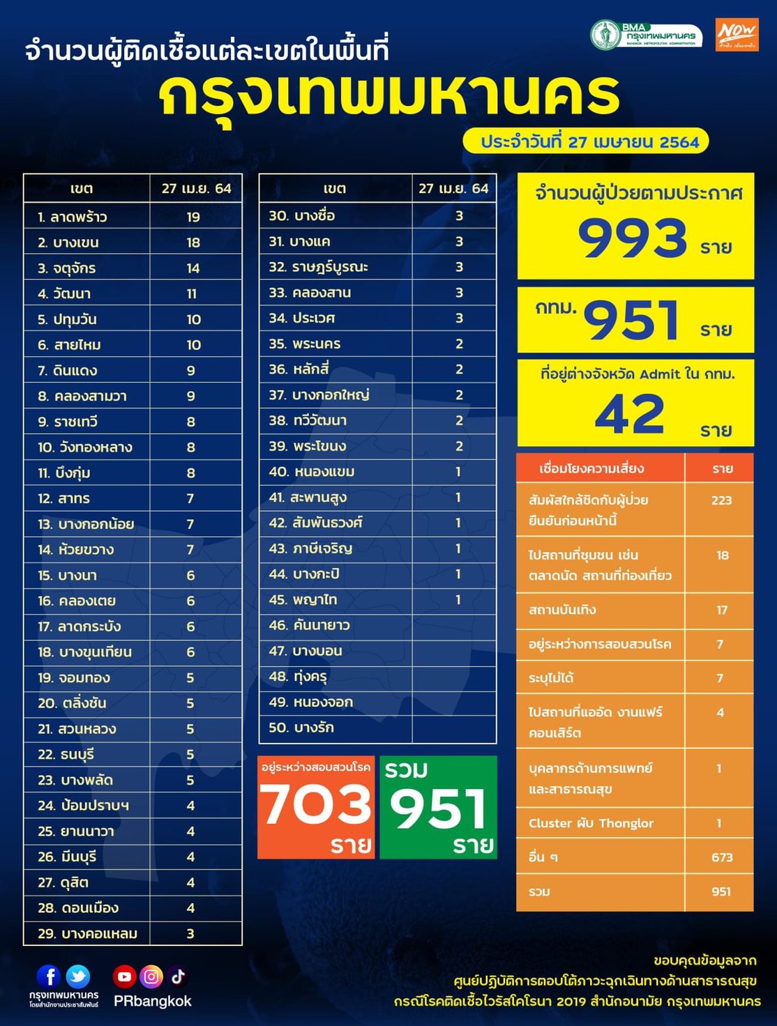ทั้งนี้ กทม.ได้เปิดจำนวนผู้ติดเชื้อรายใหม่ประจำวันที่ 27 เม.ย. 2564 พบติดเพิ่ม 993 ราย อยู่ระหว่างการสอบสวนโรค 703 ราย จากการสอบสวนโรค พบว่าเชื่อมโยงความเสี่ยงจากสัมผัสใกล้ชิดกับผู้ป่วยยืนยันก่อนหน้านี้ 223 ราย ไปสถานที่ชุมชน เช่น ตลาดนัด สถานที่ท่องเที่ยว 18 ราย สถานบันเทิง 17 ราย อยู่ระหว่างสอบสวนโรค 7 ราย ระบุไม่ได้ 7 ราย ไปสถานที่แออัด งานแฟร์ คอนเสิร์ต 4 ราย บุคลากรการแพทย์ และสาธารณสุข 1 ราย คลัสเตอร์ผับทองหล่อ 1 ราย อื่น ๆ 673 ราย รวม 951 ราย อยู่ต่างจังหวัดแต่แอดมิทในกทม. 42 ราย