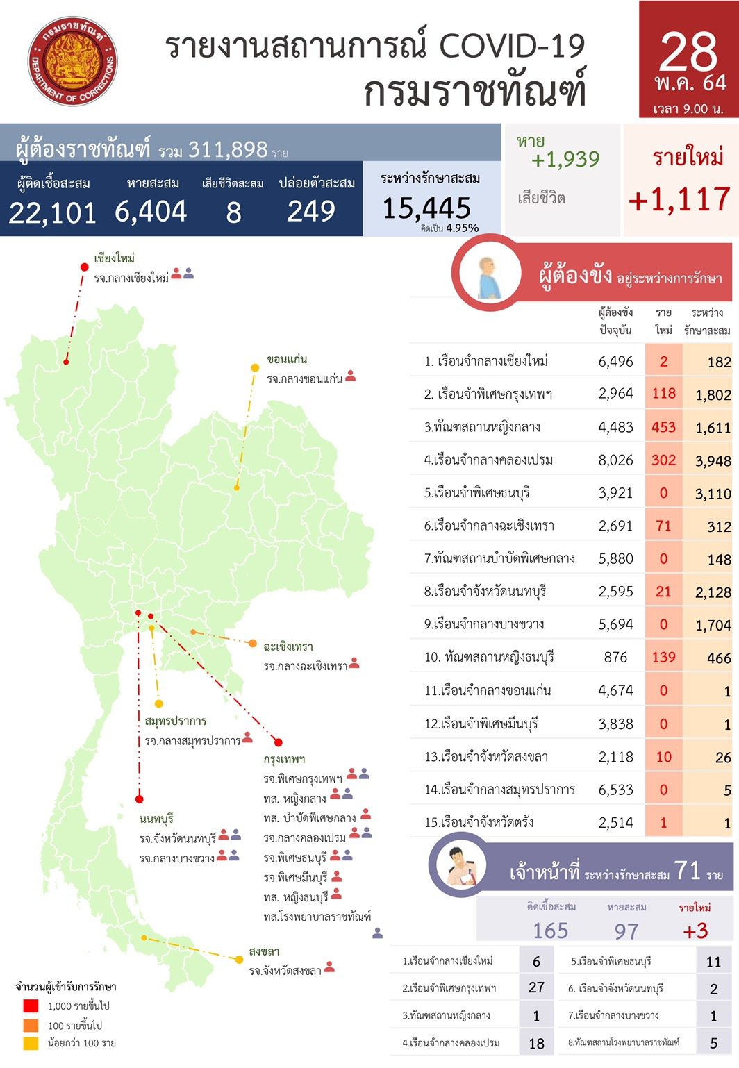 ข้อมูล ณ วันที่ 28 พฤษภาคม 2564 เวลา 09.00 น. มีผู้ต้องขังติดเชื้อรายใหม่ จำนวน 1,117 ราย รักษาหาย 1,939 ราย