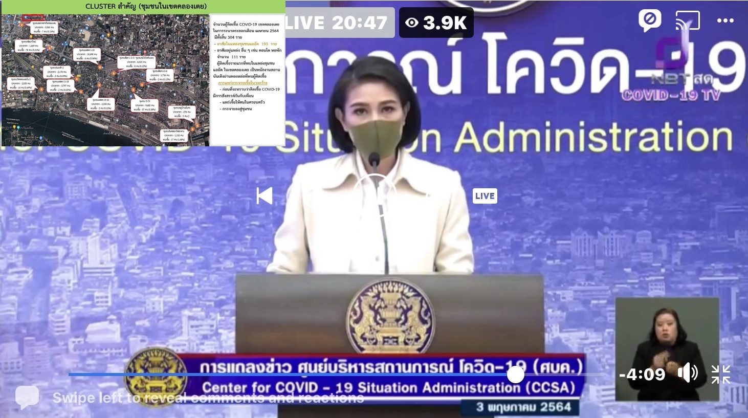 พญ.อภิสมัย กล่าวว่า ศบค.พูดถึงชุมชนบ่อนไก่ แขวงลุมพินี เขตปทุมวัน พบป่วยยืนยัน 60 ราย ศูนย์บริการสาธารณสุข มีการจัดการใกล้เคียงชุมชนคลองเตย มีรถพระราชทานลงพื้นที่ ให้ข้อมูลประชาสัมพันธ์คนกลุ่มเสี่ยงให้แยกกักที่บ้าน ขอให้ดูรายละเอียดเรื่องการสุ่มตรวจ จะตรวจให้ได้ 4,000 ราย ขอคนในพื้นที่ติดตามรายละเอียด ผู้นำชุมชน สถานประกอบการติดตามข่าวและดูแลบุคลากรในความดูแลด้วย