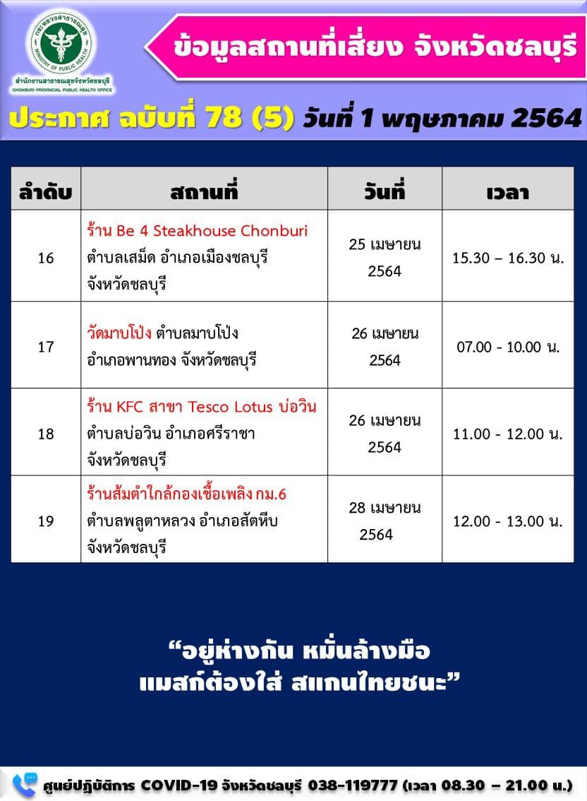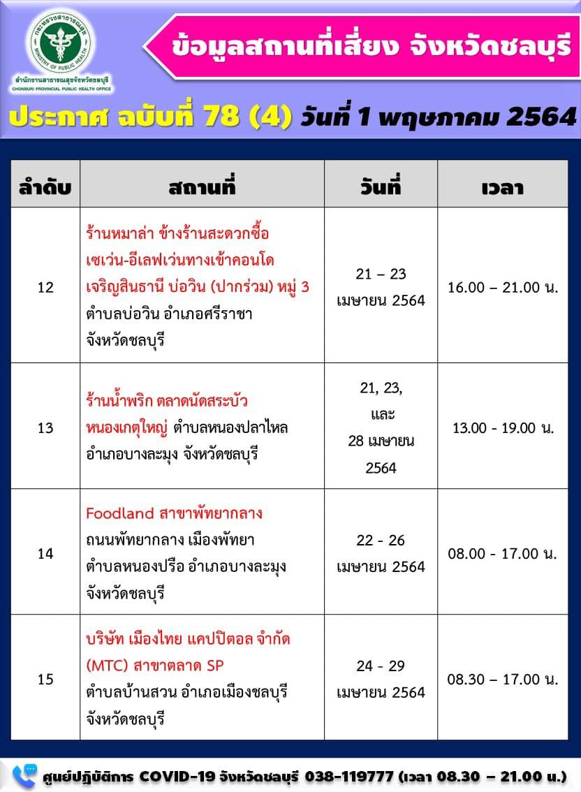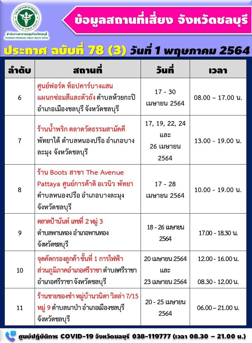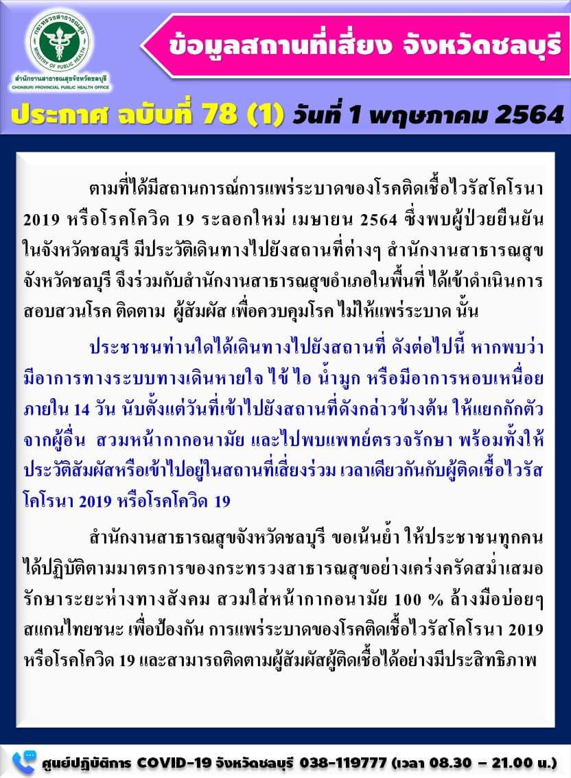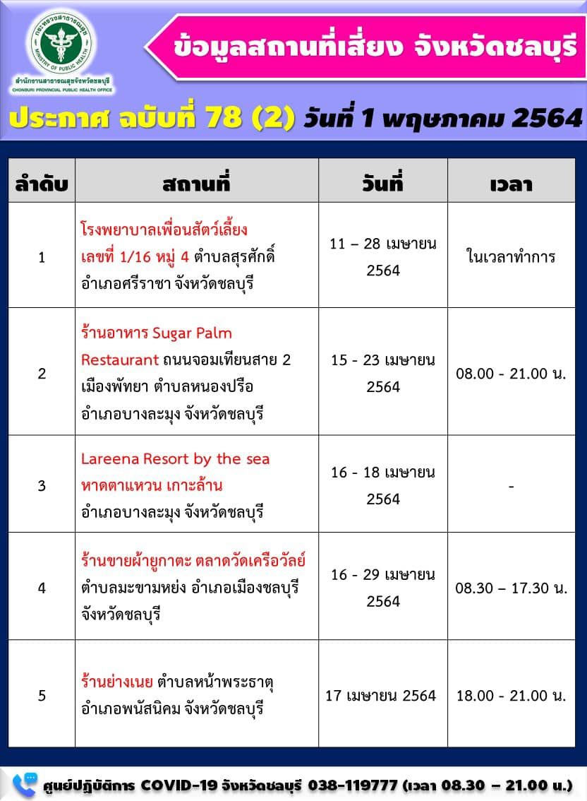 ขณะเดียวกัน สสจ.ชลบุรี ยังออกประกาศสถานที่เสี่ยงจังหวัดชลบุรี ฉบับที่ 78 โดยมีรายละเอียด ดังนี้