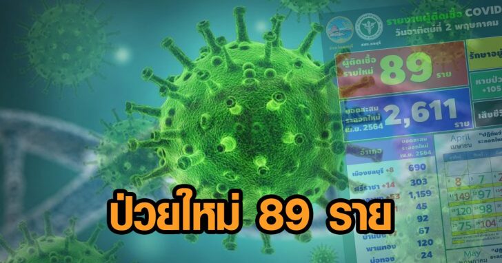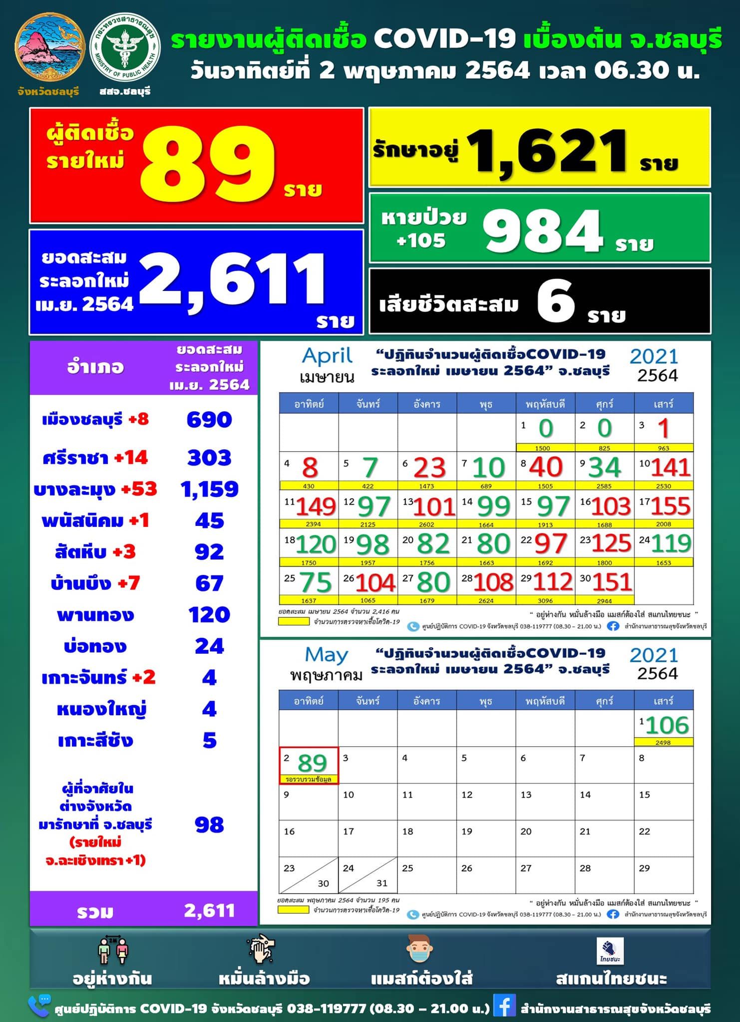 เมื่อเวลา 06.30 น. สำนักงานสาธารณสุขจังหวัดชลบุรี สสจ.ชลบุรี รายงานข้อมูลผู้ติดเชื้อโควิด-19 ประจำวันที่ 2 พฤษภาคม โดยพบผู้ติดเชื้อรายใหม่จำนวน 89 ราย ส่งผลให้มียอดผู้ป่วยสะสมในระลอกใหม่เมษายน 2564 แล้ว 2,611 ราย สำหรับผู้ป่วยใหม่ 89 คนนั้น มีรายละเอียด ดังนี้