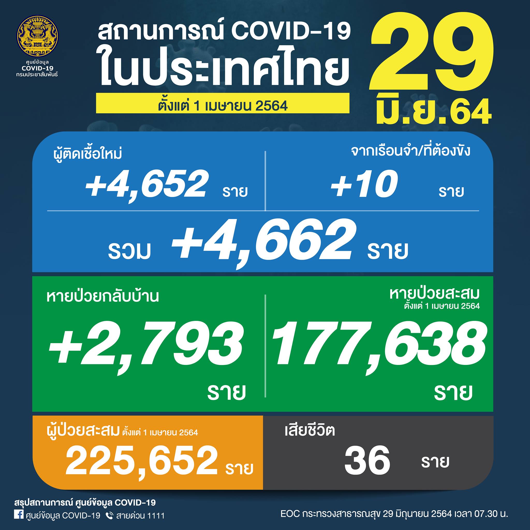 วันที่ 30 มิถุนายน 2564 นายแพทย์ทวีศิลป์ วิษณุโยธิน โฆษกศูนย์บริหารสถานการณ์การแพร่ระบาดของโรคติดเชื้อไวรัสโคโรนา 2019 (โควิด-19) หรือ ศบค. รายงานสถานการณ์ในวันนี้