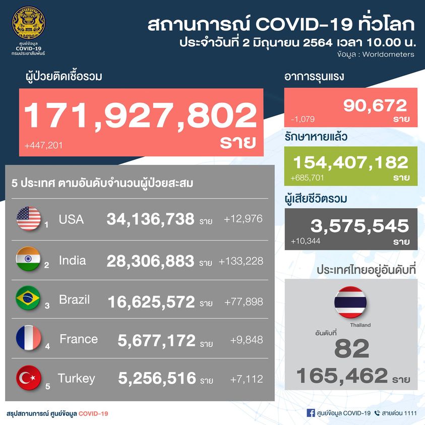 สถานการณ์โรคติดเชื้อไวรัสโคโรนา 2019 (COVID-19) ทั่วโลก ยอดผู้ติดเชื้อรวม 171,927,802 ราย อาการรุนแรง 90,672 ราย รักษาหายแล้ว 154,407,182 ราย เสียชีวิต 3,575,545 ราย