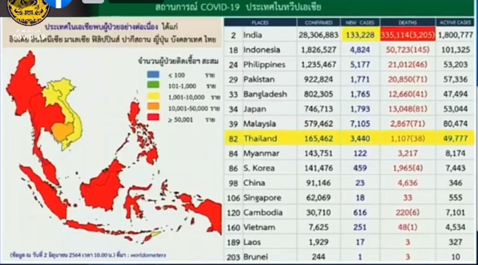 วันพุธที่ 2 มิถุนายน 2564 เวลา 12.30 น. ที่ทำเนียบรัฐบาล แพทย์หญิงอภิสมัย ศรีรังสรรค์ ผู้ช่วยโฆษกศูนย์บริหารสถานการณ์การแพร่ระบาดของโรคติดเชื้อไวรัสโคโรนา 2019 (โควิด-19) หรือ ศบค. แถลงรายงานสถานการณ์ผู้ติดเชื้อโควิด-19 ในประเทศไทยว่า พบติดเชื้อรายใหม่รวม 3,440 ราย แบ่งเป็นจากระบบเฝ้าระวังและระบบบริการ 1,175 ราย ค้นหาผู้ติดเชื้อเชิงรุกในชุมชน 1,163 รายผู้เดินทางมาจากต่างประเทศ 15 ราย และรวมกับติดเชื้อจากเรือนจำ 1,087 ส่วนผู้เสียชีวิตรายใหม่ 38 ราย