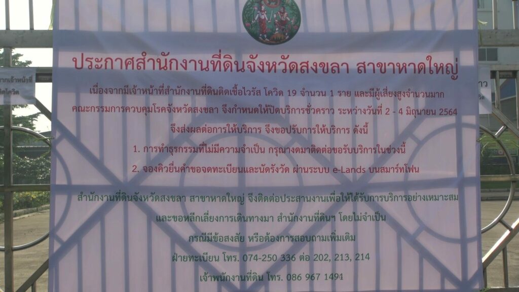 เมื่อวันที่ 4 มิถุนายน สำนักงานที่ดินจังหวัดสงขลา สาขาหาดใหญ่ ยังคงต้องงดให้บริการ ภายหลังพบพนักงานติดเชื้อ 1 ราย และให้มีการตรวจเชื้อพนักงานทั้งหมดกว่า 60 ราย ในขณะนี้ยังไม่พบผู้ติดเชื้อเพิ่ม ในขณะที่ได้มีการประชาสัมพันธ์ให้ประชาชนที่ใช้บริการที่ช่องบริการ 9 สำนักงานที่ดินจังหวัดสงขลา สาขาหาดใหญ่ ตั้งแต่ 24 พฤษภาคมเข้าทำการตรวจหาเชื้อเชิงรุก พร้อมกักตัว 14 วัน