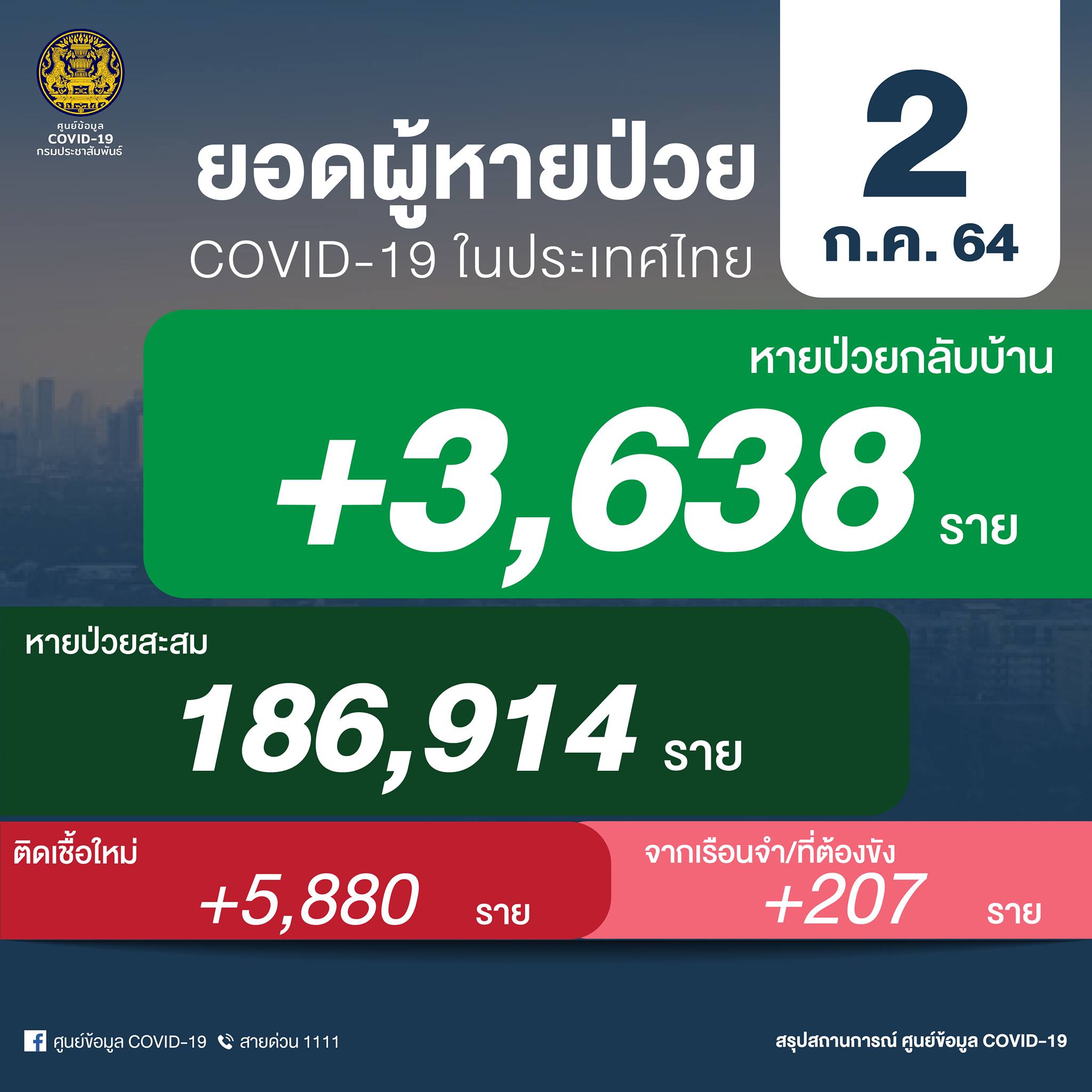 วันที่ 2 กรกฎาคม 2564 ศูนย์ข้อมูล COVID-19 ของรัฐบาล และศูนย์ EOC กระทรวงสาธารณสุข (สธ.) รายงานข้อมูลเบื้องต้น สถานการณ์ผู้ติดเชื้อโควิด-19 ประจำวันว่า วันนี้พบผู้ติดเชื้อรายใหม่รวม 6,087 ราย จำแนกเป็น ติดเชื้อใหม่ 5,880 ราย ติดเชื้อภายในเรือนจำ/ที่ต้องขัง 207 ราย หายป่วยกลับบ้าน 3,638 ราย ผู้ป่วยสะสม 242,058 ราย (ตั้งแต่ 1 เมษายน) เสียชีวิตเพิ่ม 61 ราย รวมมีผู้เสียชีวิตสะสม 2,141 ราย แล้ว
