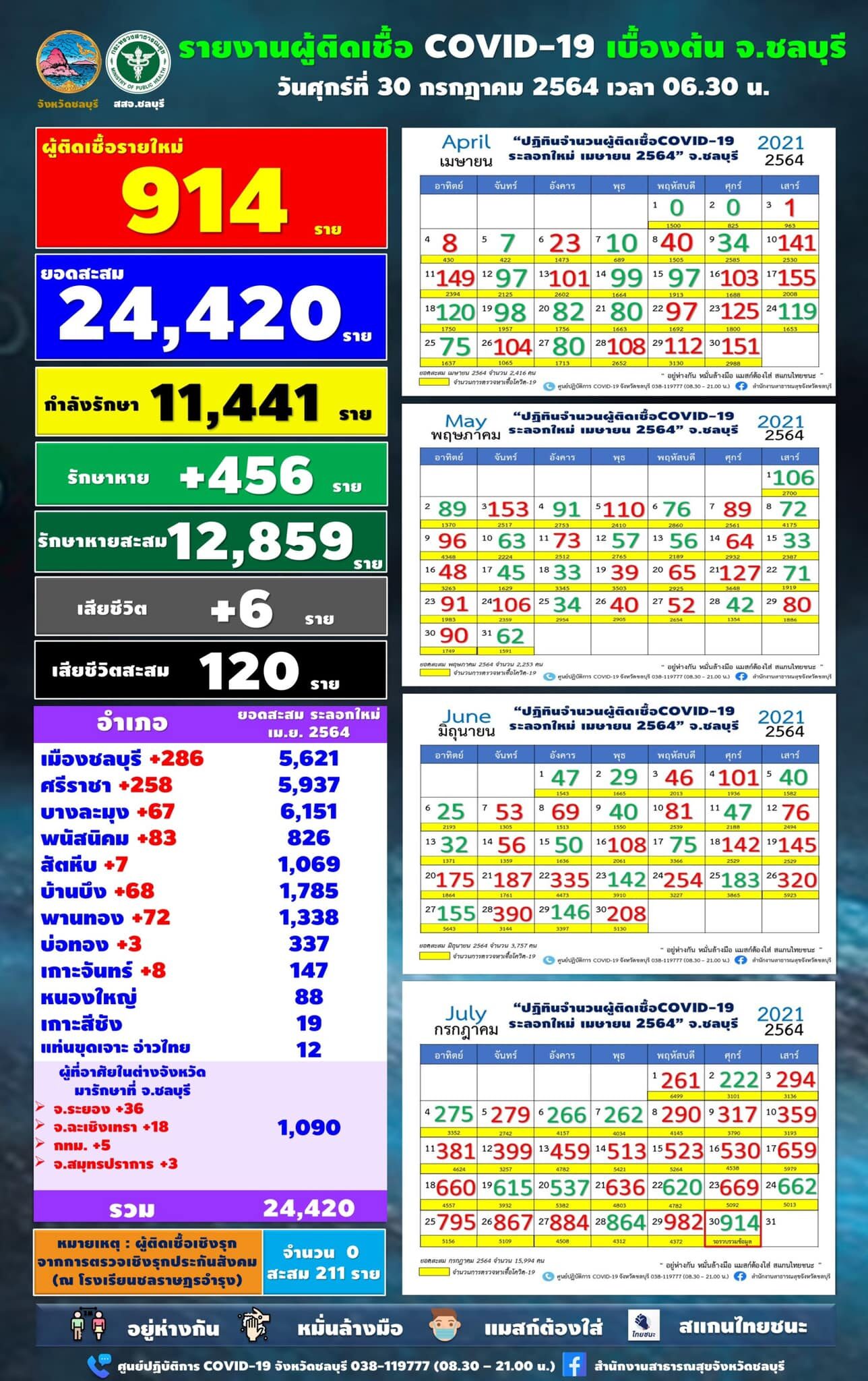 เมื่อวันที่ 30 กรกฎาคม สำนักงานประชาสัมพันธ์จังหวัดชลบุรี โพสต์ข้อความผ่านเฟซบุ๊ก รายงานสถานการณ์การติดเชื้อไวรัสโควิด-19 ระบุว่า วันนี้มีรายงานผู้ติดเชื้อโควิด-19 รายใหม่ จำนวน 914 ราย