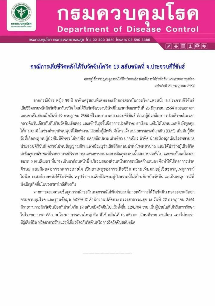 เมื่อวันที่ 28 กรกฎาคม ผู้สื่อข่าว จ.ประจวบคีรีขันธ์ รายงานว่า กรมควบคุมโรค กระทรวงสาธารณสุขได้เผยแพร่เอกสารสรุปผลกรณีหญิงชาวประจวบฯ เสียชีวิตหลังได้รับวัคซีนสลับชนิด ไม่เกี่ยวข้องกับวัคซีน คณะผู้เชี่ยวชาญเหตุการณ์ไม่พึงประสงค์ภายหลังการได้รับวัคซีนและกรมควบคุมโรค เผยแพร่ข้อมูลฉบับวันที่ 23 กรกฎาคม 2564 โดยระบุว่า จากกรณีข่าวหญิง 39 ปี ครูสอนพิเศษ และเจ้าของสถาบันกวดวิชาแห่งหนึ่งจังหวัดประจวบคีรีขันธ์ เสียชีวิตภายหลังฉีดวัคซีนสลับชนิด โดยได้รับวัคซีนของบริษัทซิโนแวคเข็มแรกวันที่ 28 มิถุนายน 2564 และแอสตร้าเซนเนก้าเข็ม 2 เมื่อวันที่ 19 กรกฎาคม 2564 ที่โรงพยาบาลประจวบคีรีขันธ์