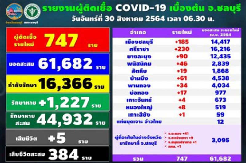 เมื่อวันที่ 30 สิงหาคม 2564 เพจ “สำนักงานสาธารณสุขจังหวัดชลบุรี สสจ.ชลบุรี” รายงานสรุปสถานการณ์การแพร่ระบาดของโรคโควิด-19 เนื้อหาว่า วันนี้มีรายงานผู้ติดเชื้อโควิด-19 รายใหม่ จำนวน 747 ราย เสียชีวิต 5 ราย