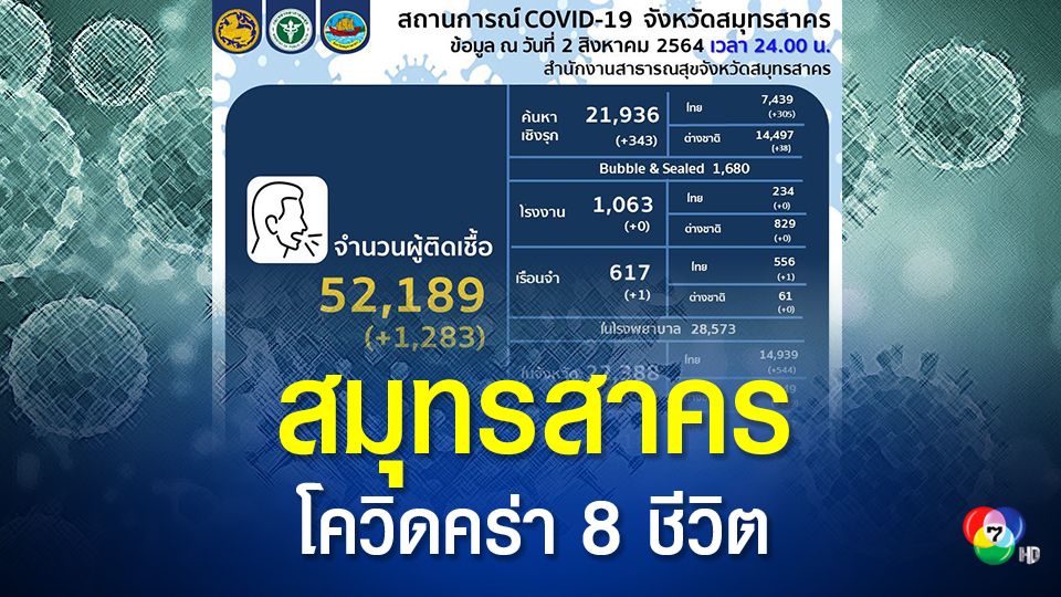 สมุทรสาครติดเชื้อใหม่ 1,283 คน เสียชีวิต 8 คน รพ.สนามเหลือว่าง 168 เตียง - ช่อง 7