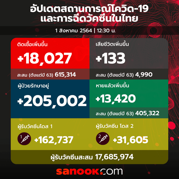 ล่าสุด สถานการณ์การแพร่ระบาดของโรคติดเชื้อไวรัสโคโรนา 2019 (COVID-19) หรือ โควิด-19 ในไทยวันนี้ พบผู้ติดเชื้อรายใหม่เพิ่ม 18,027 ราย แบ่งเป็นผู้ติดเชื้อใหม่ 17,653 ราย และผู้ติดเชื้อในเรือนจำ 374 ราย ยอดติดเชื้อรวมระลอกเมษายน 586,451 ราย รวมยอดติดเชื้อสะสม 615,314 ราย เสียชีวิตเพิ่ม 133 ราย เสียชีวิตสะสม 4,990 ราย หายป่วยเพิ่ม 13,402 ราย ยังรักษาตัวอยู่ 205,002 ราย