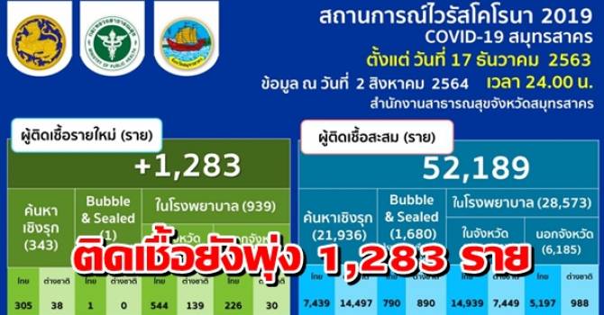 เมื่อวันที่ 3 สิงหาคม 2564 ผู้สื่อข่าวรายงาน สถานการณ์การระบาดของโรคติดเชื้อโควิด 19 จังหวัดสมุทรสาคร จากการรายงานข้อมูลของสำนักงานสาธารณสุขจังหวัดสมุทรสาคร เมื่อเวลา 24.00 น. ของวันที่ 2 สิงหาคม 2564 พบผู้ติดเชื้อรายใหม่ มีจำนวน 1,283 ราย จำแนกเป็นพบผู้ติดเชื้อจากค้นหาเชิงรุก 343 ราย และพบผู้ติดเชื้อที่มาจากการเข้ารับการตรวจในโรงพยาบาลอีก 939 ราย ในจำนวนนี้เป็นคนที่อยู่ในจังหวัดสมุทรสาคร 683 ราย และที่เหลือเป็นคนนอกจังหวัดอีก 256 ราย ตรวจBubble@Sealed พบในเรือนจำ 1 ราย ด้านผู้ติดเชื้อสะสมทั้งหมดรวม 52,189 ราย รักษาหายกลับบ้านแล้ว 31,191 ราย อยู่ระหว่างการรักษา 20,850 ราย และ ผู้เสียชีวิตรายใหม่ 8 ราย รวมมีผู้เสียชีวิตสะสมอยู่ที่ 148 ราย