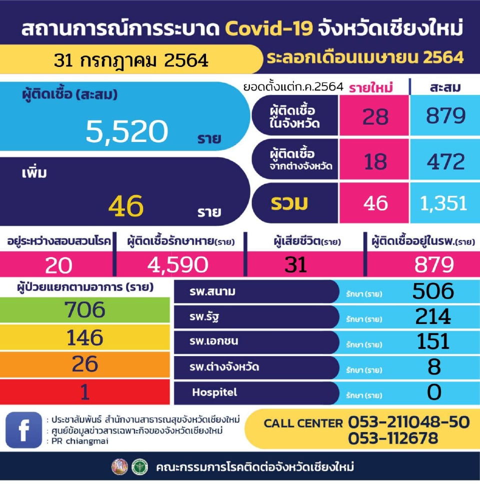 ขณะที่สถานการณ์การแพร่ระบาดโรคโควิด-19 ประจำวันที่ 31 ก.ค. 64) พบผู้ติดเชื้อรายใหม่ จำนวน 46 ราย โดยเป็นผู้ติดเชื้อในจังหวัด 28 ราย และเป็นผู้ติดเชื้อจากต่างจังหวัดอีก 18 ราย ทำให้ผู้ติดเชื้อสะสมเดือนกรกฎาคม 2564 อยู่ที่ 1,351 ราย ส่วนยอดผู้เสียชีวิตสะสมยังคงอยู่ที่ 31 ราย ส่วยยอดผู้ติดเชื้อสะสมของจังหวัดเชียงใหม่ ตั้งแต่วันที่ 1 เมษายน 2564 (ระลอกเดือนเมษายน) จนถึงปัจจุบัน มีผู้ติดเชื้อสะสมแล้วทั้งหมด 5,520 ราย และรักษาหายแล้ว 4,590 ราย