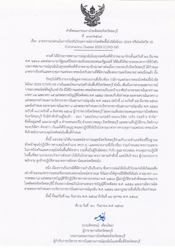 นายภัครธรณ์ เทียนไชย ผู้ว่าราชการจังหวัดชลบุรี ประธานคณะกรรมการโรคติดต่อจังหวัดชลบุรี ผู้กำกับการบริหารในสถานการณ์ฉุกเฉินในเขตพื้นที่จังหวัดชลบุรีคำสั่งคณะกรรมการโรคติดต่อจังหวัดชลบุรี ที่109/2564 ลงวันที่ 20 ก.ย.2564 เนื่องจากมีการแพร่ระบาดของโรคติดเชื้อไวรัสโควิด-19 ภายแคมป์คนงานก่อสร้างในพื้นที่ จ.ชลบุรี