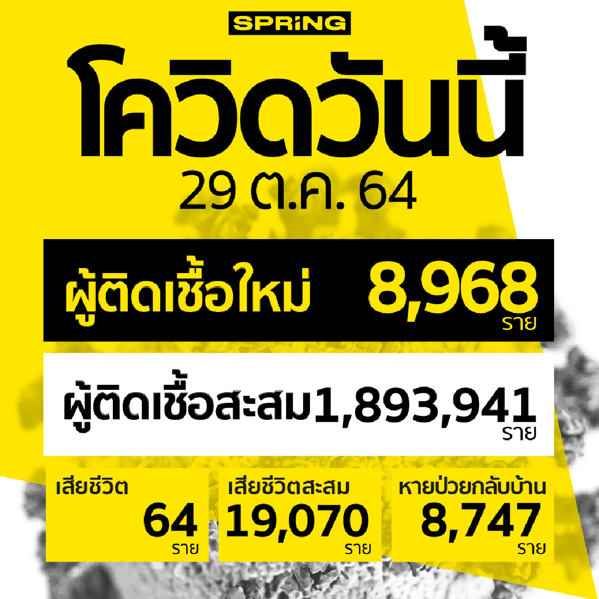 วันที่ 29 ต.ค. 64 ศูนย์บริหารสถานการณ์แพร่ระบาดของโรคติดเชื้อไวรัสโคโรนา 2019 (โควิด-19) รายงานสถานการณ์ล่าสุด พบผู้ติดเชื้อโควิด19 รายใหม่อีก 8,968 ราย ในจำนวนนี้อยู่ในเรือนจำ 190 ราย ทำให้มียอดผู้ป่วยยืนยันสะสมแล้วจนถึง 1,893,941 ราย ซึ่งในวันนี้มียอดผู้เสียชีวิต 64 ราย ทำให้มียอดผู้เสียชีวิตสะสมทะลุ 19,070 ราย และหายป่วยกลับบ้านเพิ่ม 8,747 ราย กำลังรักษา 99,301 ราย