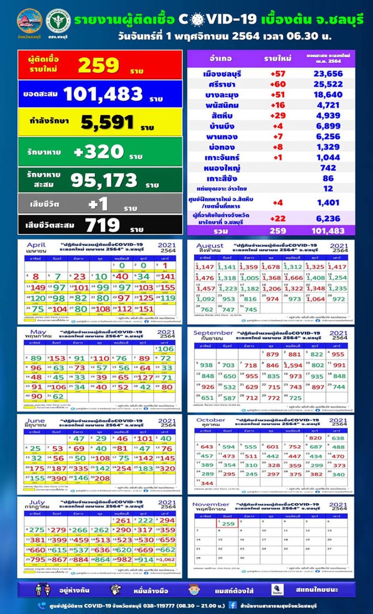 เมื่อเวลา 06.30 น.วันที่ 1 พฤศจิกายน 2564 สำนักงานประชาสัมพันธ์จังหวัดชลบุรี - Chonburi PR รายงานว่า วันนี้มีรายงานผู้ติดเชื้อโควิด-19 รายใหม่ จำนวน 259 ราย