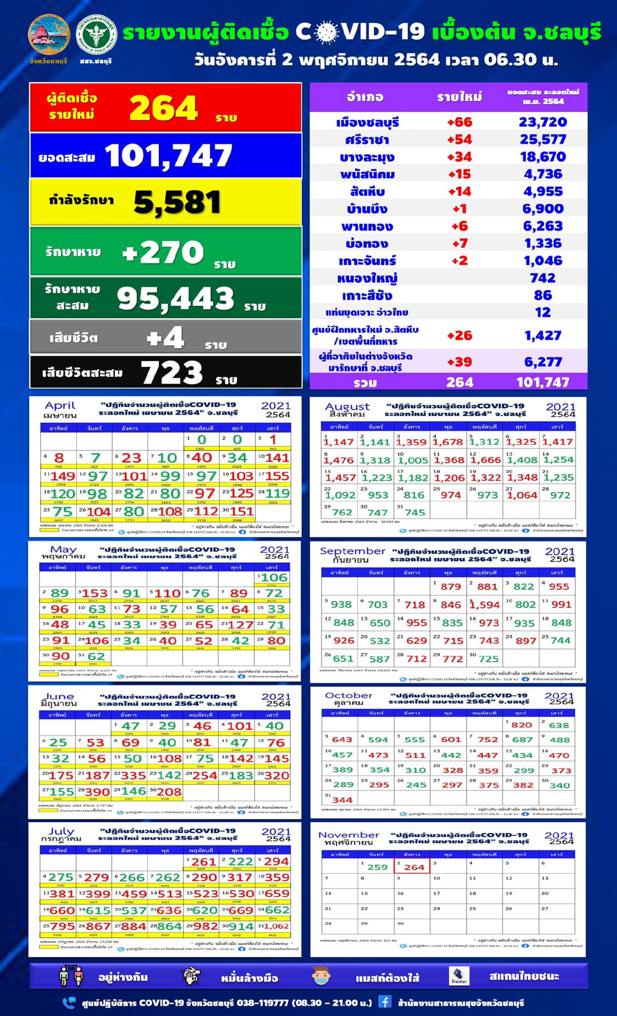 สถานการณ์ COVID-19 พื้นที่ จ.ชลบุรี วันนี้ (2 พ.ย. 64) มีรายงานผู้ติดเชื้อโควิด-19 รายใหม่ จำนวน 264 ราย เสียชีวิต 4 ราย รายละเอียดดังนี้