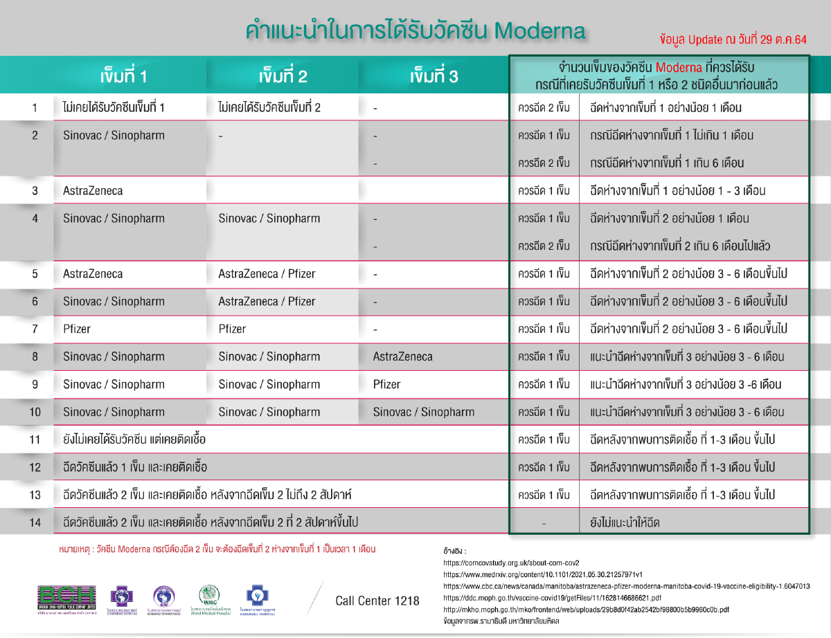 หมายเหตุ : วัคซีน "โมเดอร์นา" Moderna กรณีต้องฉีด 2 เข็ม จะต้องฉีดเข็มที่ 2 ห่างจากเข็มที่ 1 เป็นเวลา 1 เดือน (สอบถามโทร 1218 กด 4 หรือ 02-910-1600-45)