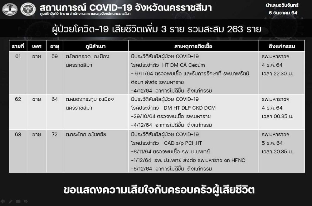 ส่วนวันนี้มีผู้เสียชีวิตชายทั้ง 3 ศพ ยอดผู้เสียชีวิตสะสมรวม 263 ราย สำหรับผู้เสียชีวิตรายที่ 261 เพศชาย อายุ 59 ปี ชาว ต.โคกกรวด อ.เมืองนครราชสีมา มีประวัติสัมผัสผู้ป่วยโควิด-19 มีโรคประจำตัว HT DM CA cecum ตรวจพบเชื้อ เข้ารักษาที่ รพ.เทพรัตน์นครราชสีมา วันที่ 4 ธ.ค. 64 ส่งต่อ รพ.มหาราชฯ อาการไม่ดีขึ้น ถึงแก่กรรม ส่วนรายที่ 262 เพศชาย อายุ 64 ปี ชาว ต.หนองกระทุ่ม อ.เมืองนครราชสีมา มีประวัติสัมผัสผู้ป่วยโควิด-19 มีโรคประจำตัว HT DM CA cecum ตรวจพบเชื้อ วันที่ 4 ธ.ค. 64 รักษาที่ รพ.มหาราชนครราชสีมา อาการไม่ดีขึ้น ถึงแก่กรรม และรายที่ 263 เพศชาย อายุ 72 ปี ชาว ต.กระโทก อ.โชคชัยฯ มีประวัติสัมผัสผู้ป่วยโควิด-19 มีโรคประจำตัว ACD s/p PCI , HT วันที่ 8 พ.ย. 64 ตรวจพบเชื้อ รักษาที่ รพ.ป.แพทย์ฯ ส่งต่อ รพ.มหาราชนครราชสีมา on HFNC วันที่ 5 ธ.ค. 64 อาการไม่ดีขึ้น ถึงแก่กรรม