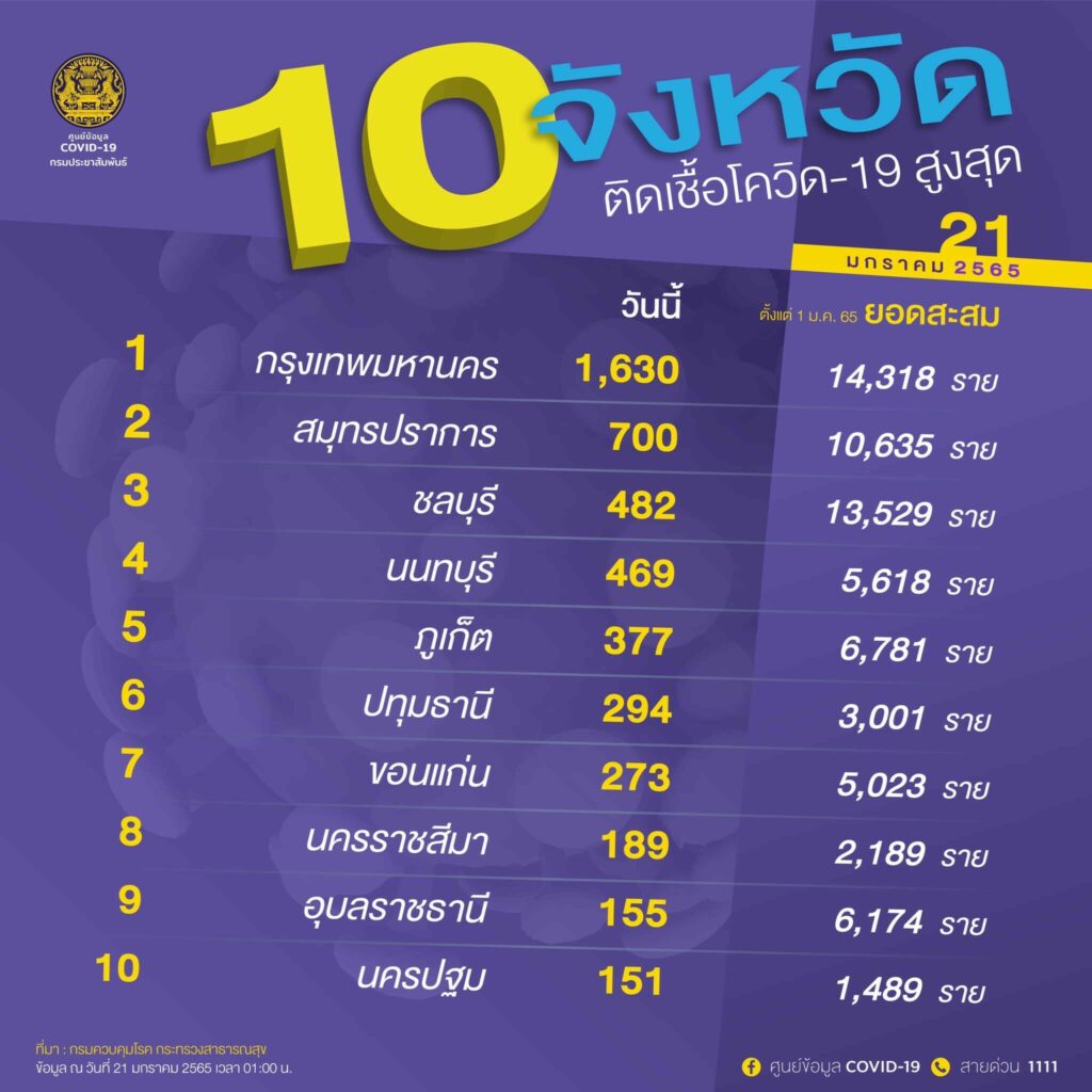 โดยในประเทศไทย จำนวนผู้ติดเชื้อสูงสุด 10 จังหวัด ได้แก่ กรุงเทพมหานคร พบผู้ติดเชื้อ 1,630 ราย สมุทรปราการ พบผู้ติดเชื้อ 700 ราย ชลบุรี พบผู้ติดเชื้อ 482 ราย นนทบุรี พบผู้ติดเชื้อ 469 ราย ภูเก็ต พบผู้ติดเชื้อ 377 ราย ปทุมธานี พบผู้ติดเชื้อ 294 ราย ขอนแก่น พบผู้ติดเชื้อ 273 ราย นครราชสีมา พบผู้ติดเชื้อ 189 ราย อุบลราชธานี พบผู้ติดเชื้อ 155 ราย และนครปฐม พบผู้ติดเชื้อ 151 ราย