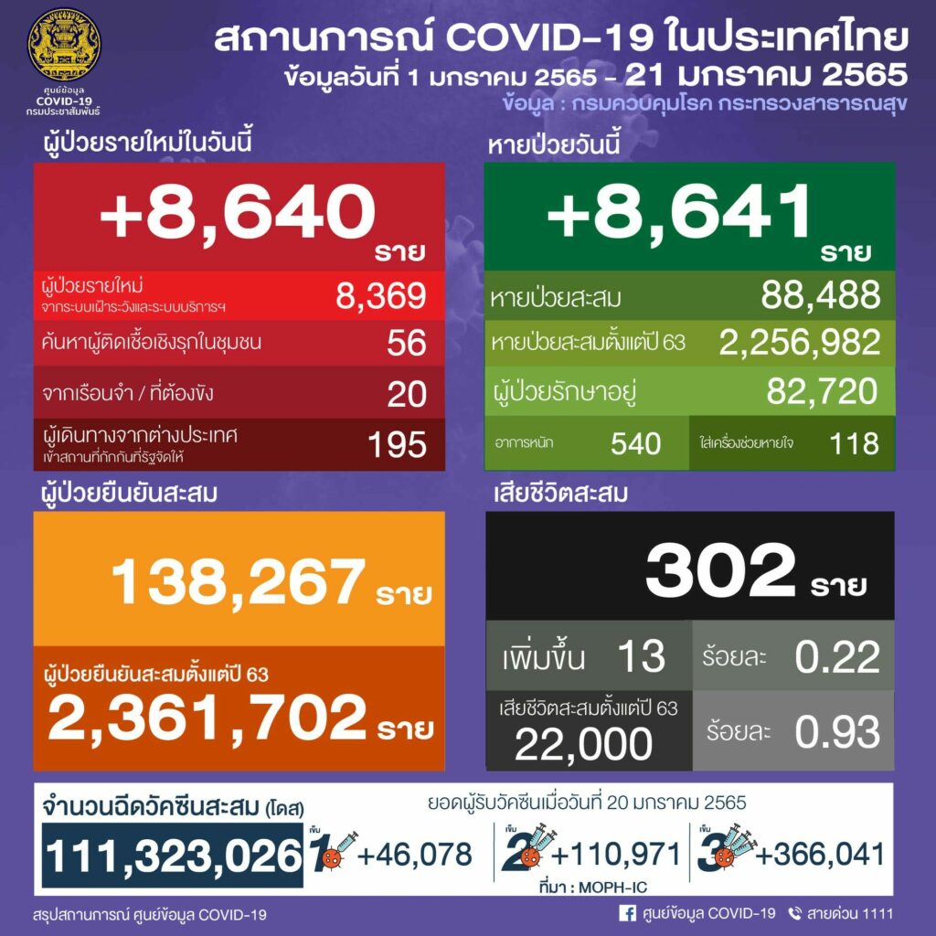 สำหรับสถานการณ์การติดเชื้อประจำวันนี้ (21 มกราคม) พบผู้ติดเชื้อรายใหม่ 8,640 ราย แบ่งเป็นผู้ป่วยจากระบบเฝ้าระวัง และระบบบริการฯ จำนวน 8,369 ราย จากการค้นหาเชิงรุกจำนวน 56 ราย จากเรือนจำจำนวน 20 ราย และผู้ที่เดินทางจากต่างประเทศจำนวน 195 ราย ซึ่งทำให้มีจำนวนผู้ป่วยรวมสะสม 138,267 ราย ในส่วนของผู้ที่หายป่วยวันนี้ มีจำนวน 8,641 ราย รวมหายป่วยสะสม 88,488 ราย มีผู้ป่วยที่กำลังเข้ารับการรักษาอยู่ 82,720 ราย แบ่งเป็นผู้ป่วยอาการหนัก 540 ราย และใส่เครื่องช่วยหายใจ 118 ราย สำหรับตัวเลขผู้เสียชีวิตในวันนี้มีจำนวน 13 ราย รวมเสียชีวิตสะสม 302 ราย คิดเป็นร้อยละ 0.22
