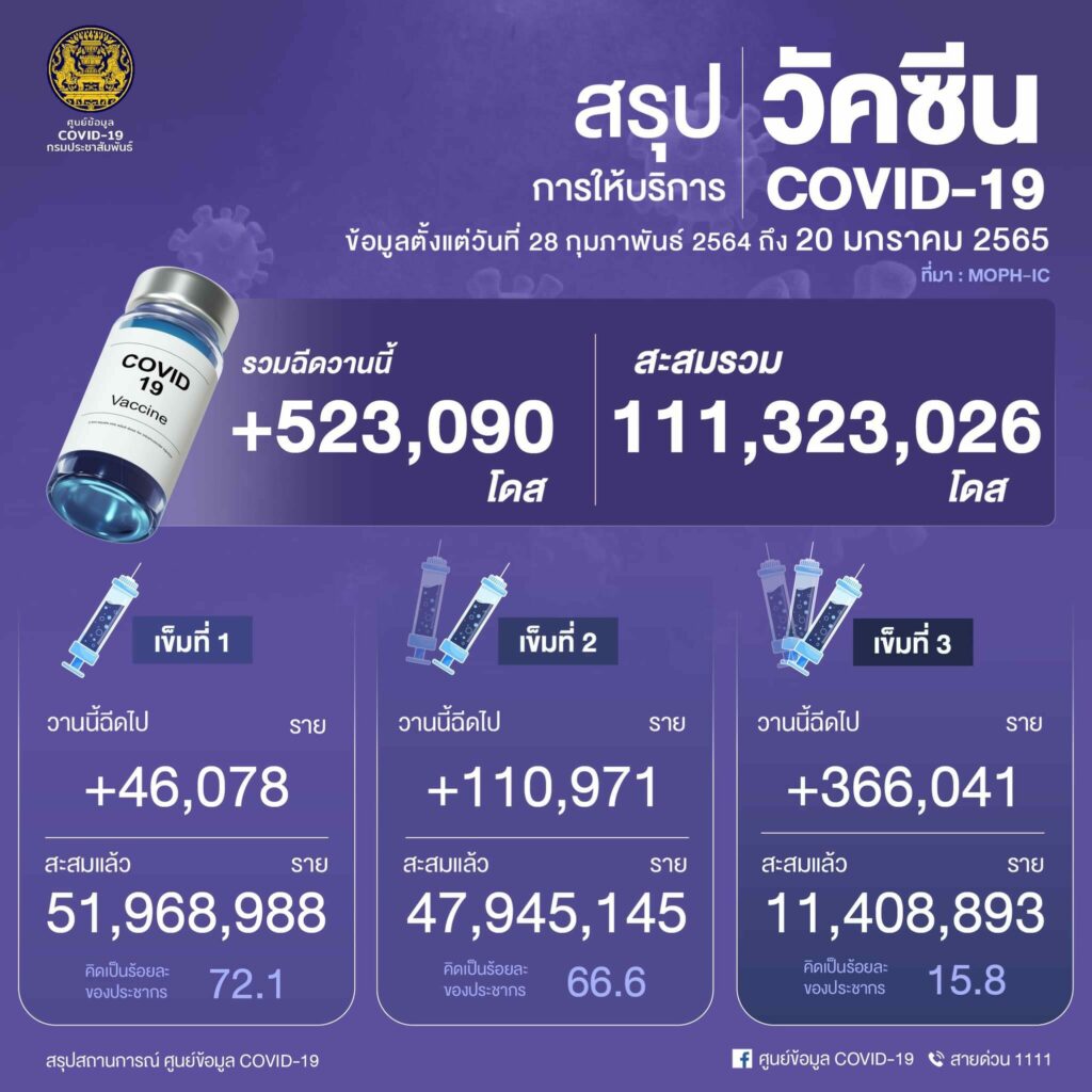 ด้านการฉีดวัคซีน ประเทศไทยฉีดวัคซีนแล้วรวม 111,323,026 โดส โดยวันนี้ฉีดวัคซีนไป 523,090 โดส แบ่งเป็นเข็มที่ 1 เพิ่มขึ้น 46,078 ราย คิดเป็นร้อยละ 72.1 ของจำนวนประชากรทั้งหมด เข็มที่ 2 เพิ่มขึ้น 110,971 ราย คิดเป็นร้อยละ 66.6 ของจำนวนประชากรทั้งหมด และเข็มที่ 3 เพิ่มขึ้น 366,041 ราย คิดป็นร้อยละ 15.8 ของจำนวนประชากรทั้งหมด