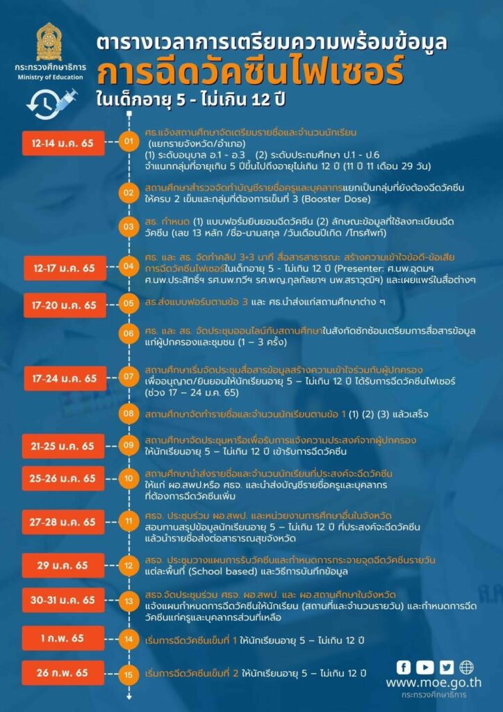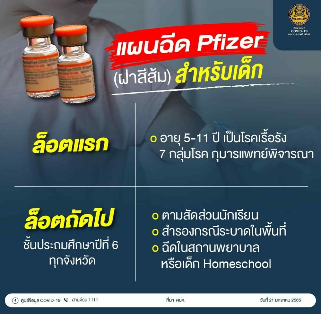 นอกจากนี้ ทาง ศบค.ยังได้ออกประกาศแผนการฉีดวัคซีนไฟเซอร์ (ฝาสีส้ม) ซึ่งเป็นสูตรสำหรับเด็กโดยเฉพาะ ในส่วนของล็อตแรก จะฉีดให้แก่เด็กอายุ 5-11 ปี ที่เป็นกลุ่มเสี่ยง โรคเรื้อรัง ทั้งหมด 7 กลุ่มโรค โดยจะต้องผ่านการพิจารณาจากกุมารแพทย์ ส่วนล็อตถัดไป สำหรับเด็กชั้นประถมศึกษาปีที่ 6 ทุกจังหวัด แบ่งฉีดตามสัดส่วนนักเรียน และสำรองกรณีระบาดในพื้นที่ ซึ่งจะทำการฉีดในสถานพยาบาล หรือเด็กที่เรียนหนังสือที่บ้าน (Homeschool) ทั้งนี้ ทางด้านกระทรวงศึกษาธิการ (ศธ.) เปิดเผยไทม์ไลน์ หรือตารางเวลาการเตรียมความพร้อมการฉีดวัคซีนไฟเซอร์ ในเด็กอายุ 5 ปี ไม่เกิน 12 ปี ซึ่งคาดว่าจะเริ่มฉีดวัคซีนเข็มที่ 1 ในวันที่ 1 ก.พ.นี้ เข็มที่ 2 ในวันที่ 26 ก.พ. เป็นต้นไป โดยมีตัวเลขเด็กนักเรียนอายุ 5-12 ปีที่ เข้าข่าย ได้รับการฉีดวัคซีน จำนวน 5.2 ล้านคน