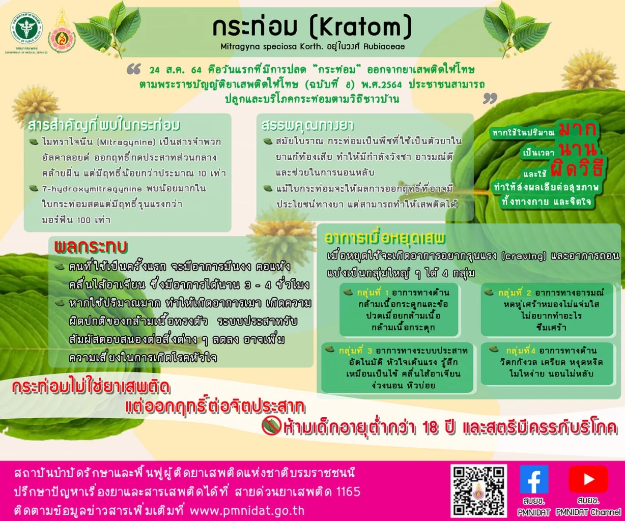 นายแพทย์สรายุทธ์ บุญชัยพานิชวัฒนา ผู้อำนวยการสถาบันบำบัดรักษาและฟื้นฟูผู้ติดยาเสพติดแห่งชาติบรมราชชนนี กล่าวเพิ่มเติมว่า ในใบกระท่อมพบว่ามีสารสำคัญ คือ ไมทราไจนีน (Mitragynine) เป็นสารจำพวกอัลคาลอยด์ ออกฤทธิ์