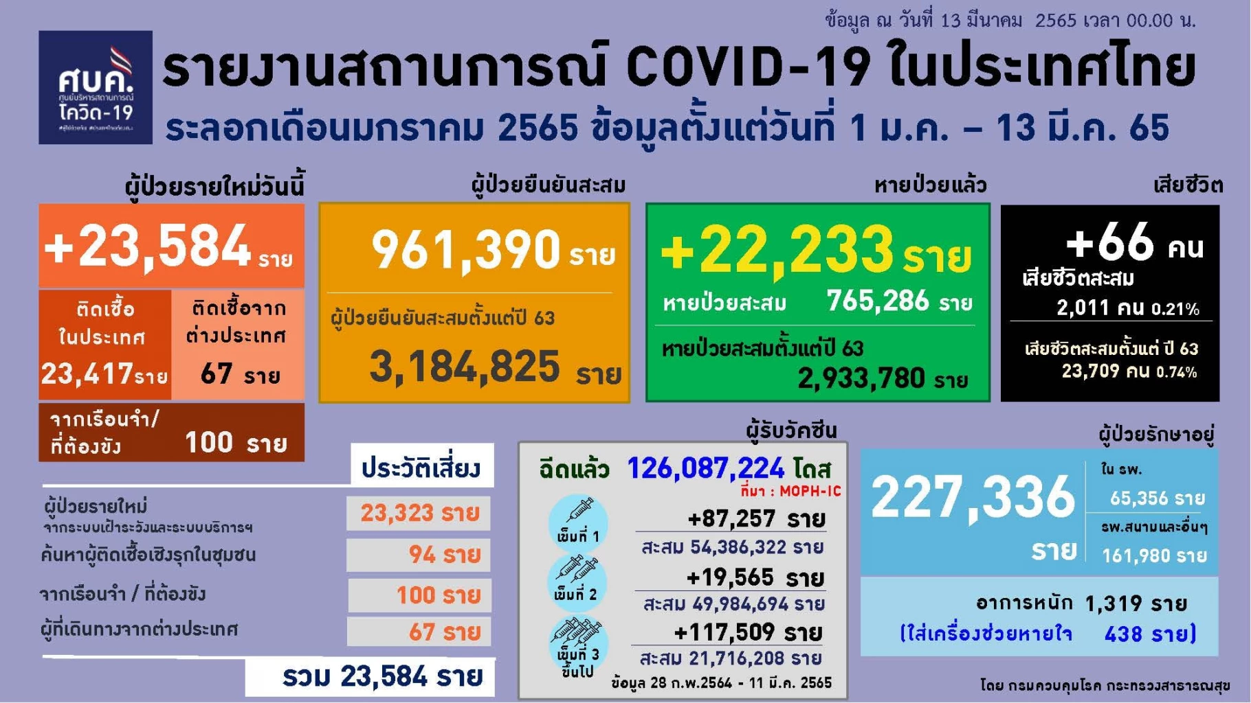 วันนี้ (13 มี.ค. 65) ศูนย์บริหารสถานการณ์โควิด-19 หรือ "ศบค." รายงาน "สถานการณ์โควิด-19" ในประเทศไทย พบผู้ติดเชื้อรายใหม่ 23,584 ราย แบ่งเป็น