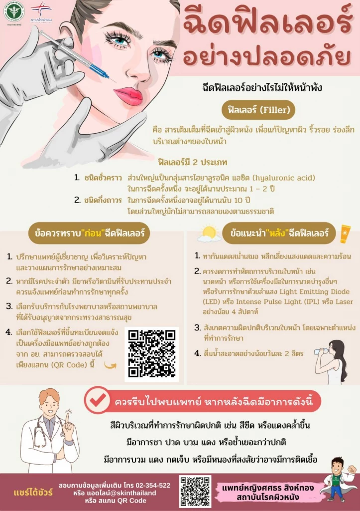 แพทย์หญิงมิ่งขวัญ วิชัยดิษฐ ผู้อำนวยการสถาบันโรคผิวหนัง กรมการแพทย์ ให้กล่าวเพิ่มเติมว่า การฉีดฟิลเลอร์ไม่ได้มาตรฐาน ฉีดไม่ถูกตำแหน่ง หรือการเลือกใช้ตัวของผลิตภัณฑ์ไม่เหมาะสม จะส่งผลให้เกิดการไหลของฟิลเลอร์ ผิวหนังบิดเบี้ยวหรือบวมหนาผิดรูป และมีปัญหาภาวะแทรกซ้อนอื่น ๆ ตามมาได้ โดยจะมีวิธีการสังเกตภาวะแทรกซ้อนหรือความผิดปกติหลังการฉีดฟิลเลอร์ ได้แก่ 1. สีผิวบริเวณตำแหน่งที่ทำการรักษาผิดปกติ เช่น ซีด หรือแดงคล้ำ 2. มีอาการปวด บวม แดงหรือช้ำมากกว่าปกติ 3. มีอาการชา 4. มีอาการบวม แดง กดเจ็บ หรือทีหนอง ที่สงสัยว่ามีการติดเชื้อหรืออักเสบที่ผิวหนัง หากมีอาการเหล่านี้ควรไปพบแพทย์โดยทันที