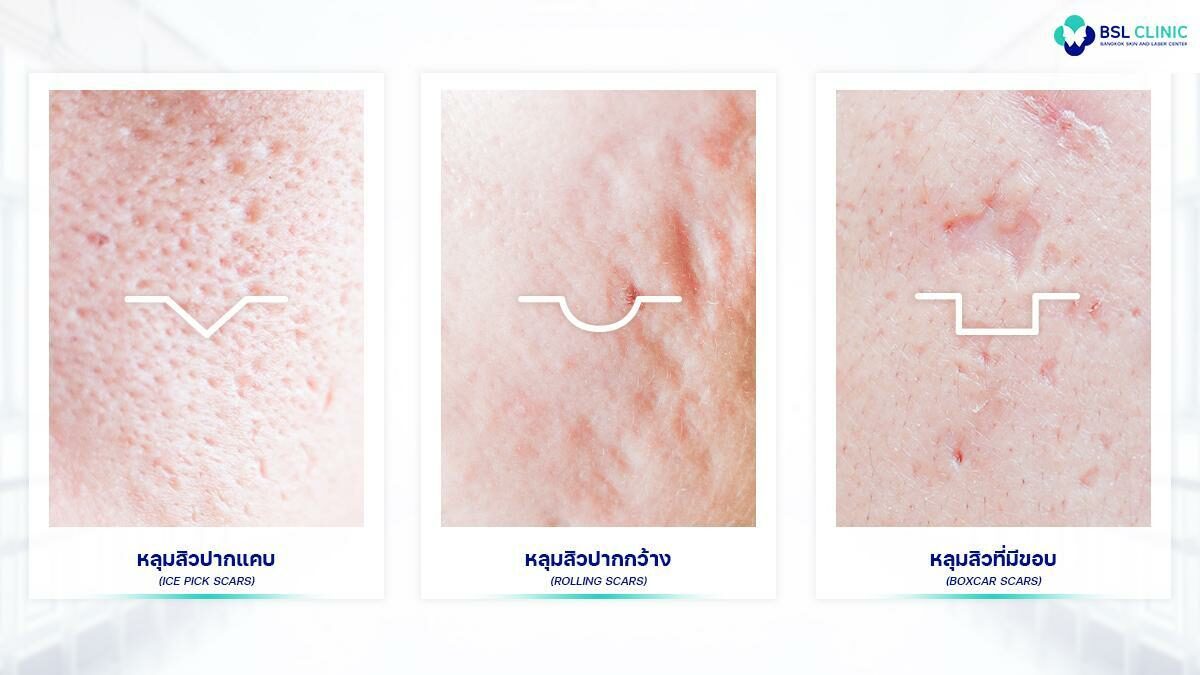 3.2 หลุมสิวปากกว้าง (Rolling Scars) ปากของหลุมสิวจะมีความกว้างประมาณ 4-5 มม. ผิวจะดูไม่เรียบเนียน ขรุขระ เห็นได้ชัดเจน