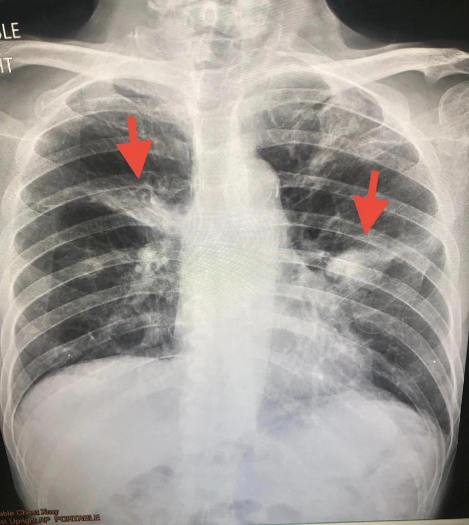 ผู้ป่วยเป็นโรคเส้นประสาทอักเสบแบบระยะเรื้อรัง (Chronic inflammatory demyelinating polyradiculoneuropathy หรือ CIDP หรือโรคซีไอดีพี) ทำให้แขนขาชาและอ่อนแรง 3 เดือน กำลังรักษาด้วยยาสเตียรอยด์ขนาดสูงและยากดภูมิเซลเซ็ป (cellcept) ตรวจร่างกาย มีไข้ อุณหภูมิ 38.1 องศาเซลเซียส ฟังเสียงปอดปกติ เอกซเรย์ปอดผิดปกติทั้ง 2 ข้าง ทำคอมพิวเตอร์สแกนปอด พบโพรงเล็กๆในบริเวณปอดที่มีปื้นสีขาวหลายตำแหน่งในปอดทั้ง 2 ข้าง